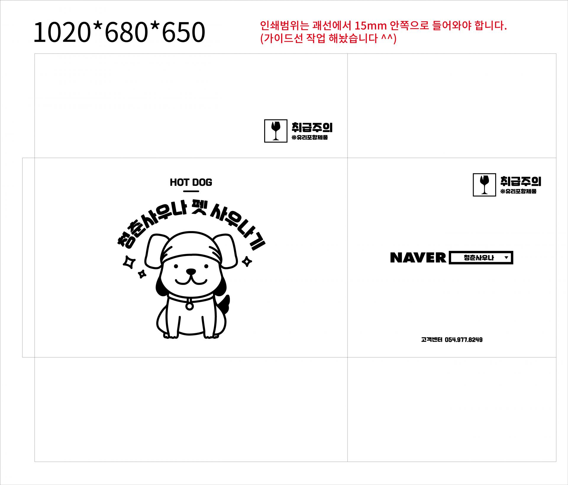 측면 부분에는 취급 주의와 네이버에 검색을 유도하는 요소와 고객센터 번호를 넣었습니다.