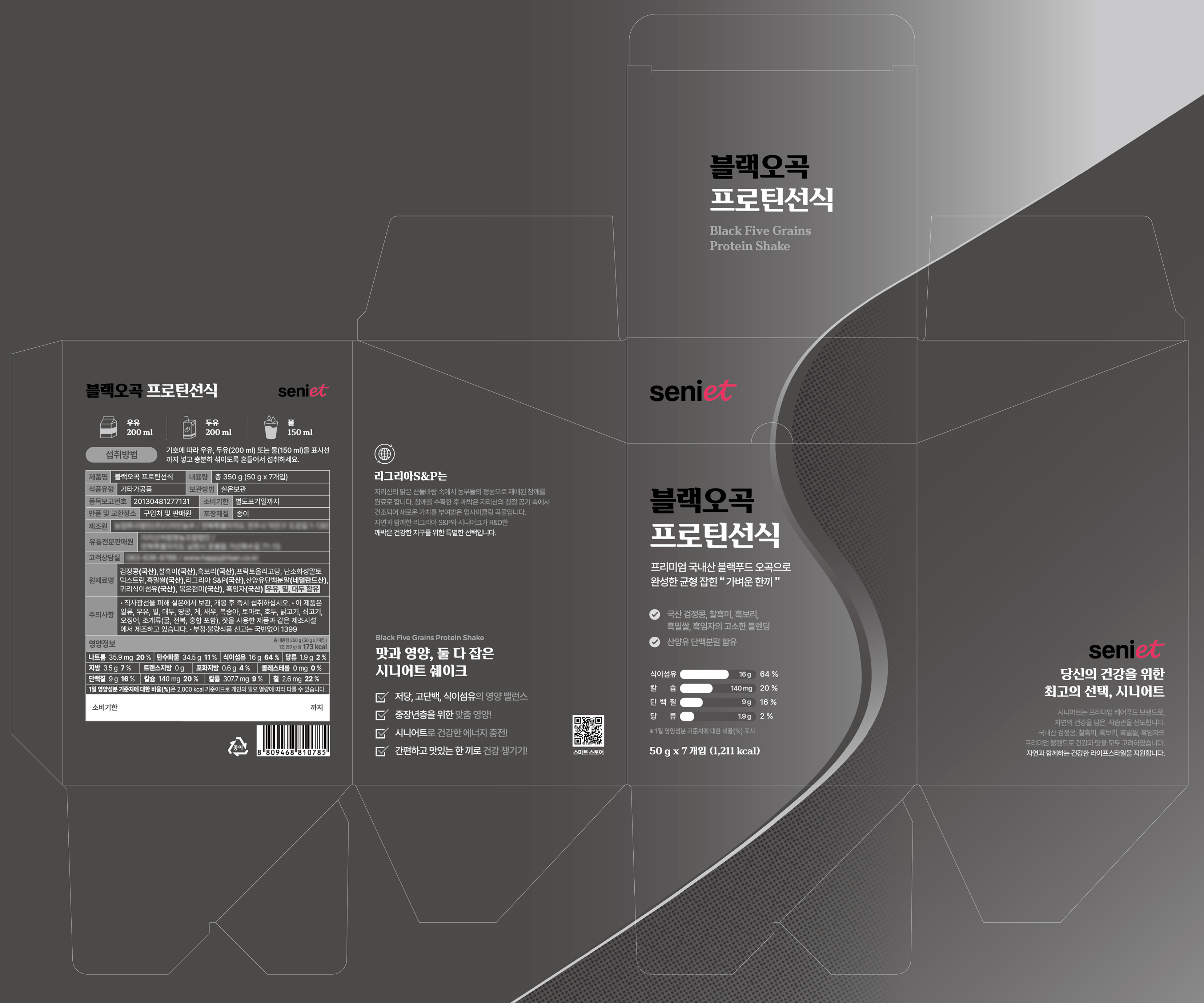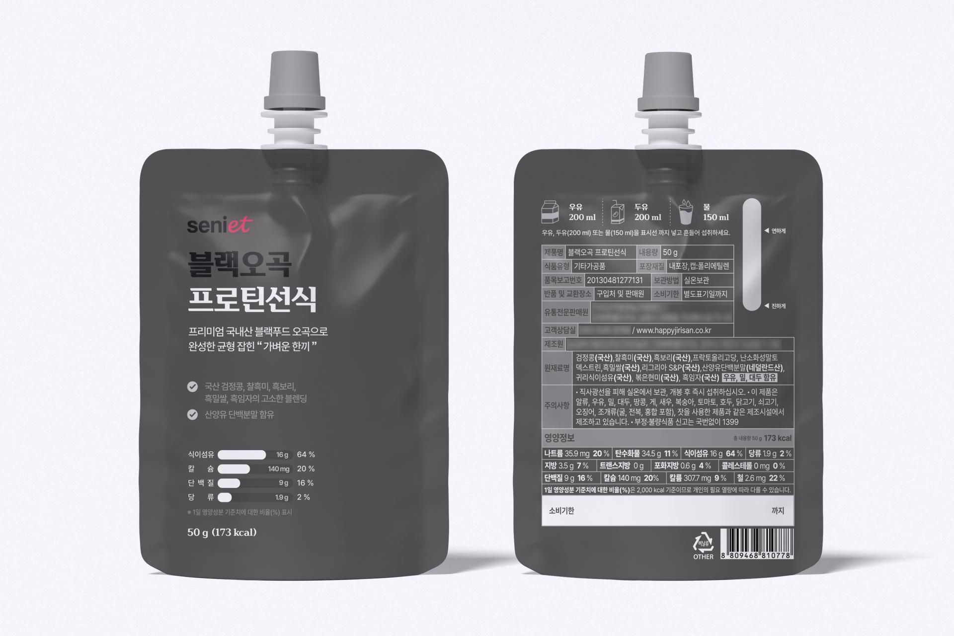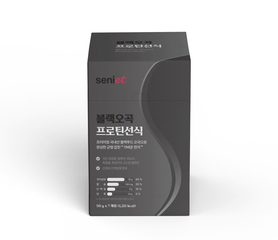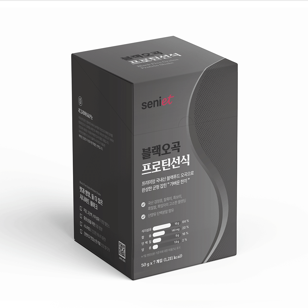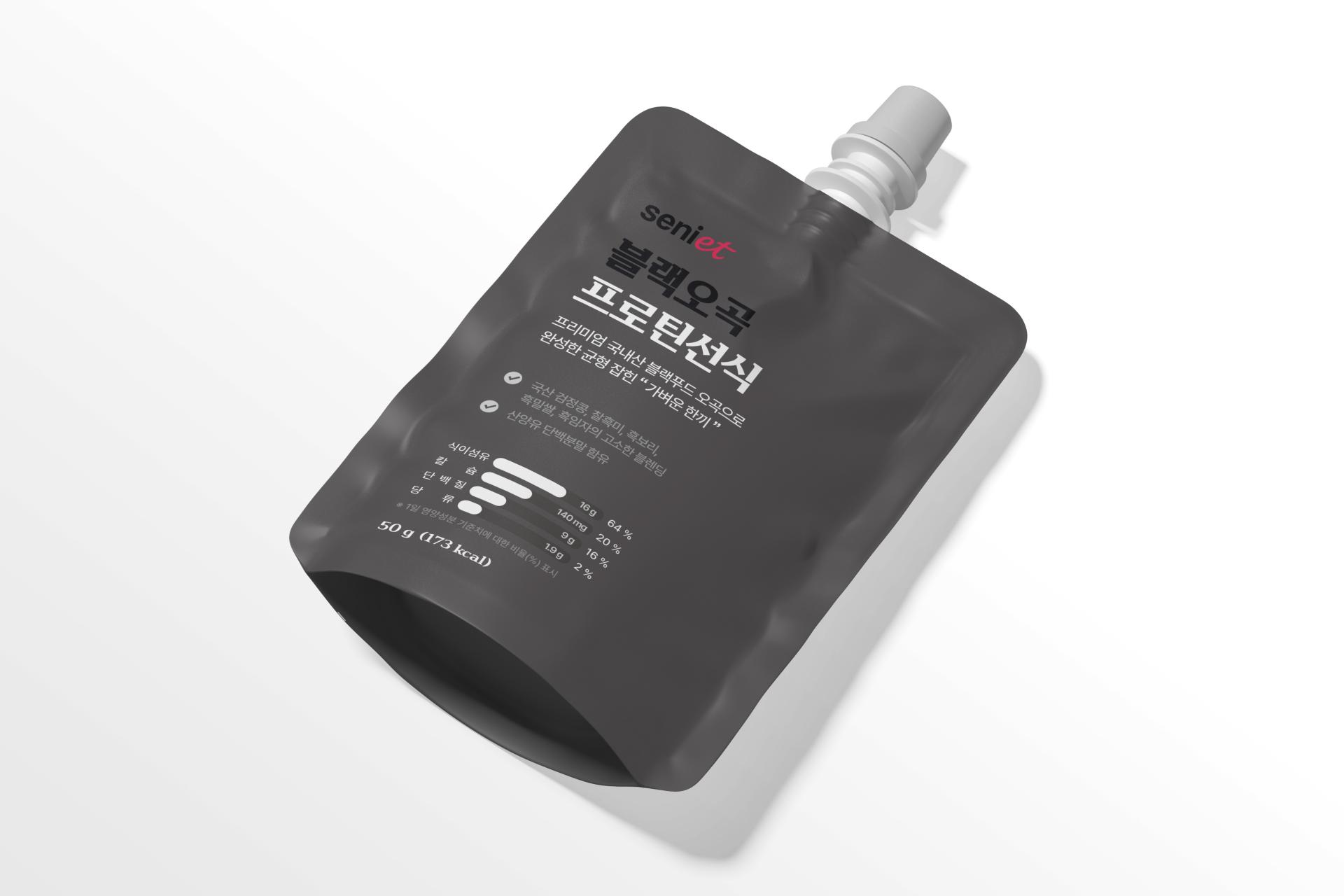 시니어트의 블랙푸드 제품의 건기식 패키지 디자인으로 브랜드의 고급스러움과