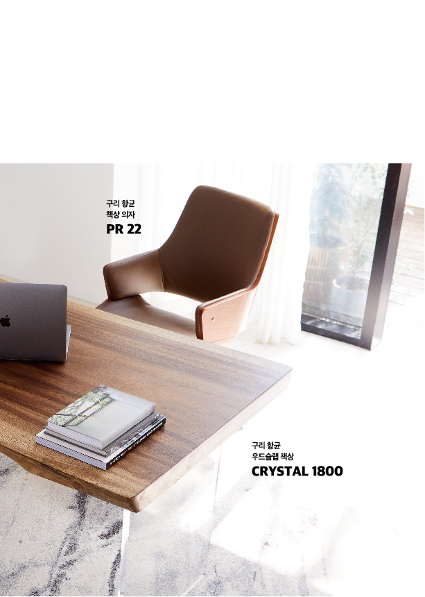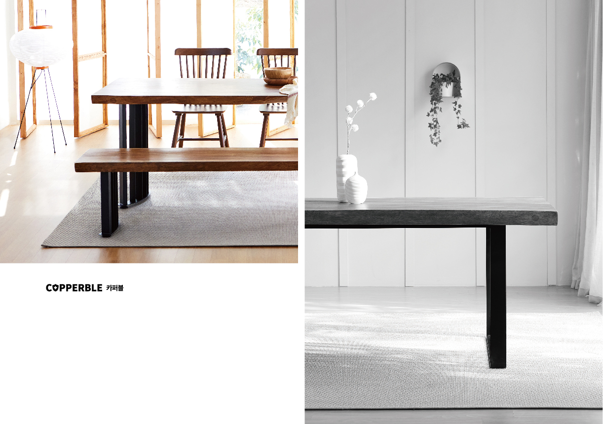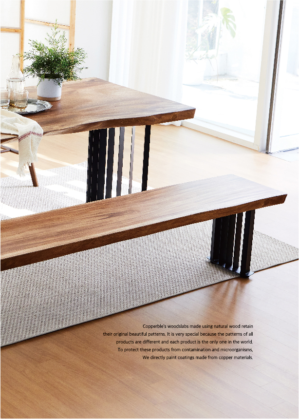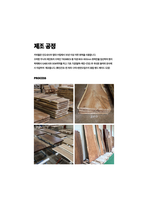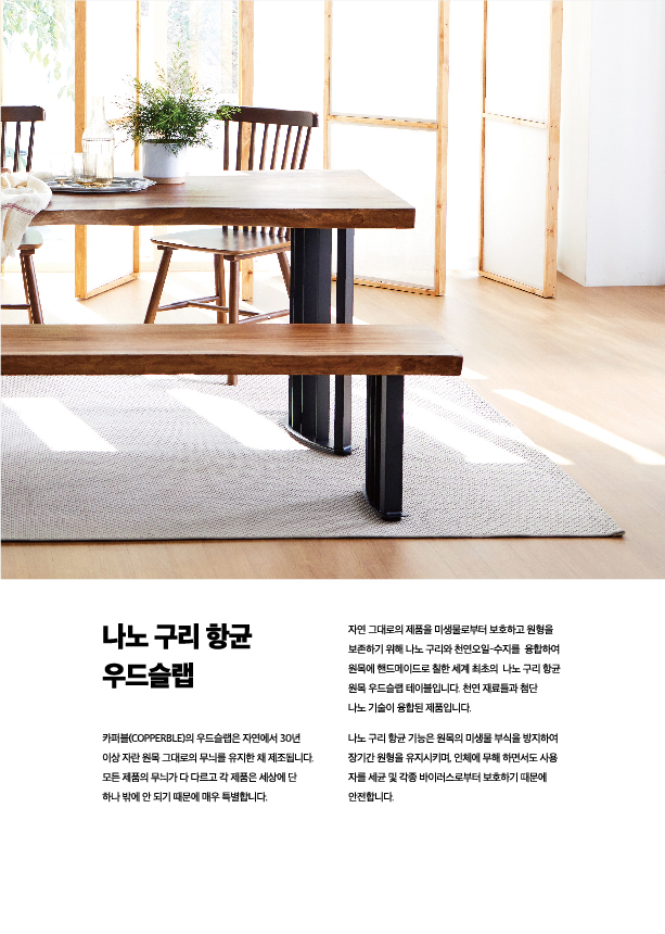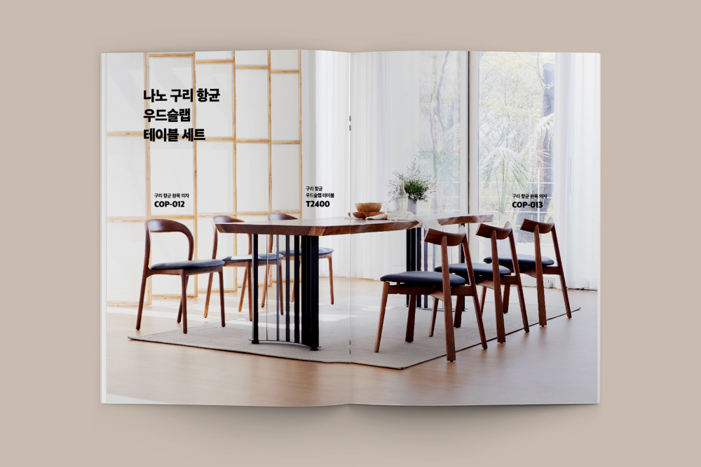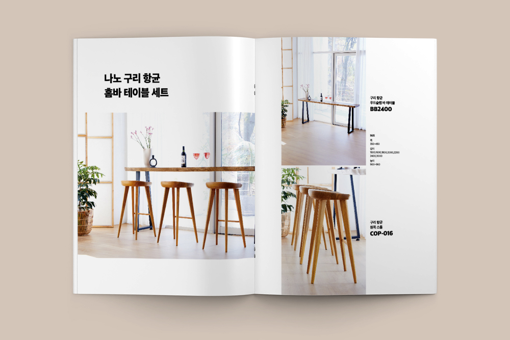 우드슬랩 가구의 고급스러움을 강조하기 위하여 심플한 화이트 백그라운드에 이미지 중심으로 레이아웃을 구성하여 카탈로그를 완성하였습니다.